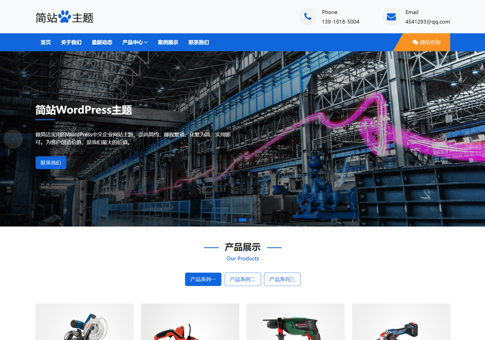 蓝色的中文wordpress企业网站模板,适合生产、加工、制造业的公司官网使用。