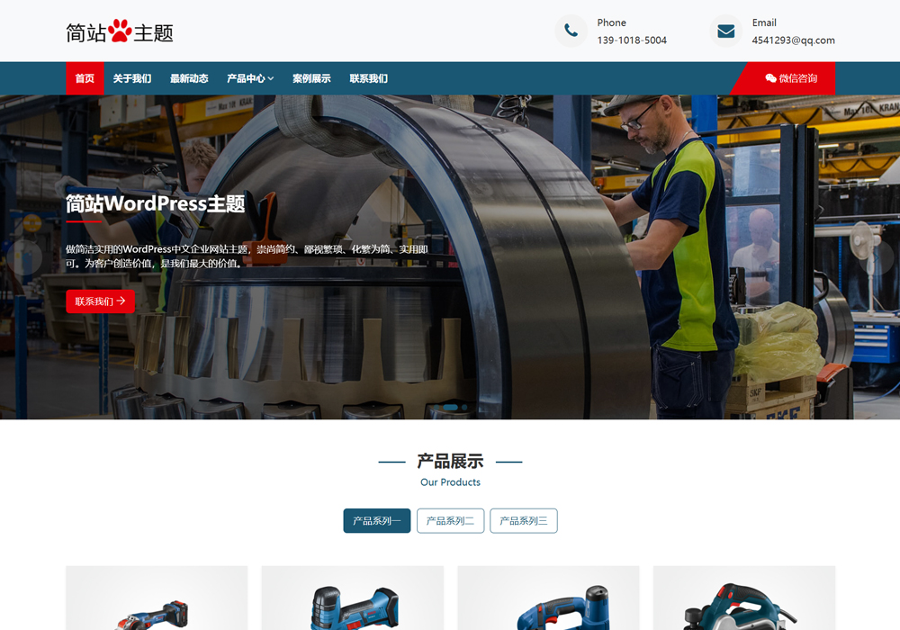 红蓝色搭配的工厂wordpress中文主题,适合从事生产、加工的工厂官方网站使用。