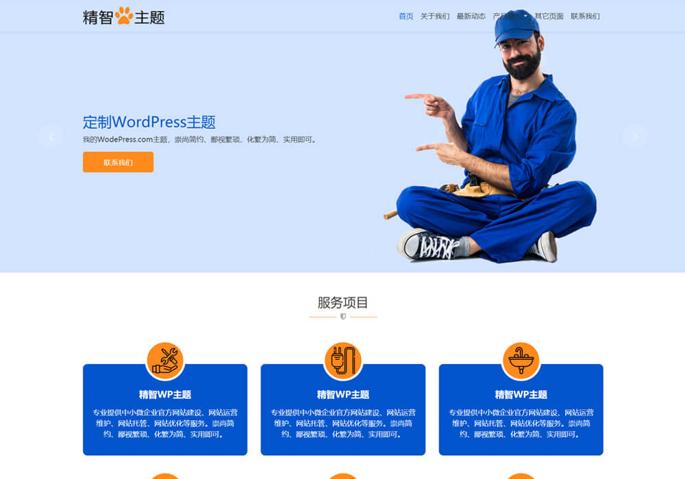 蓝色简洁的wordpress维修主题,用于家庭电工、电器或管道维修的公司使用。
