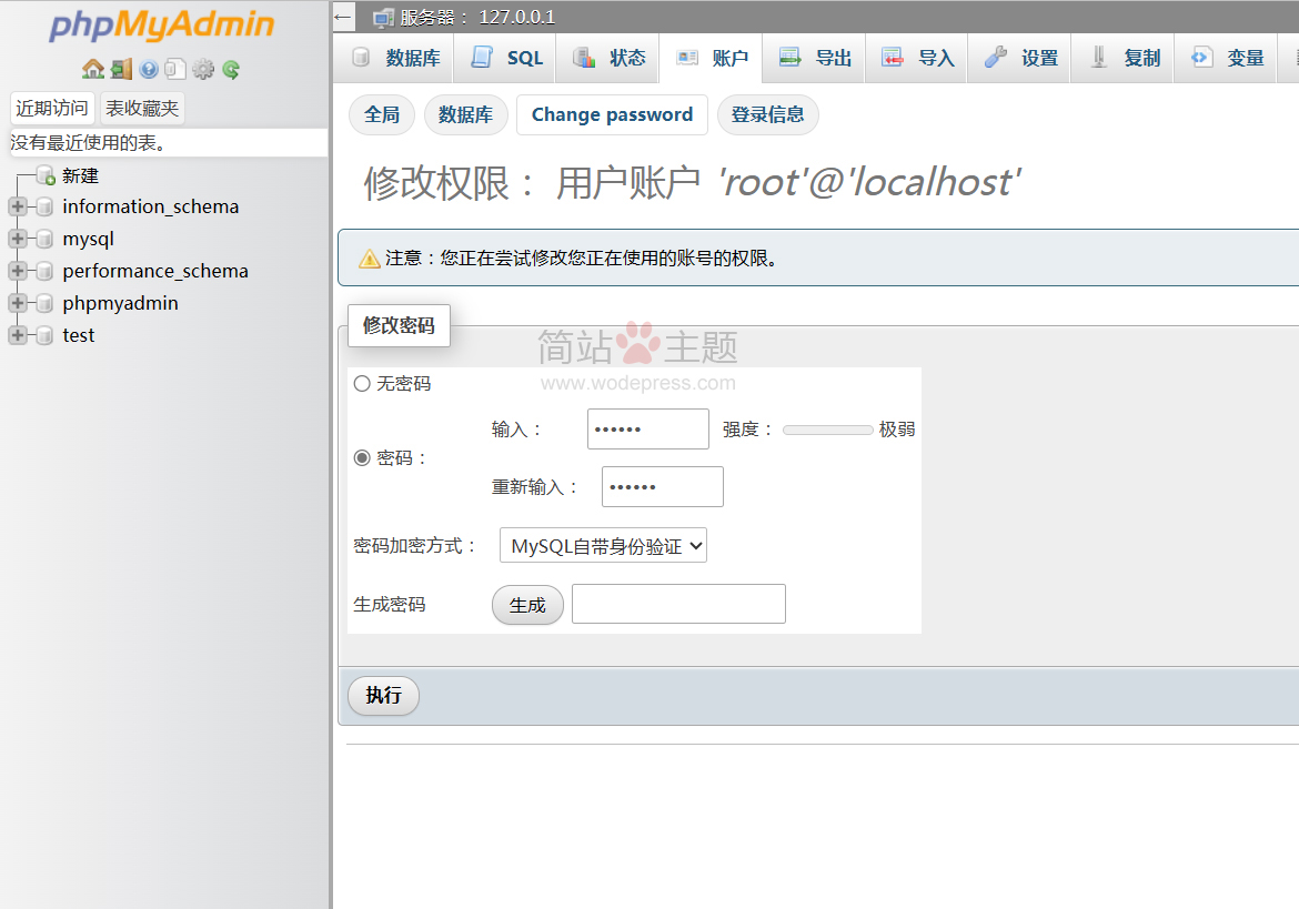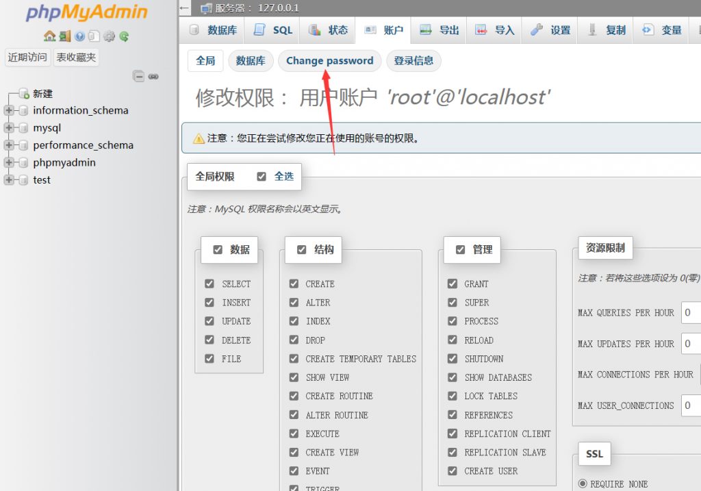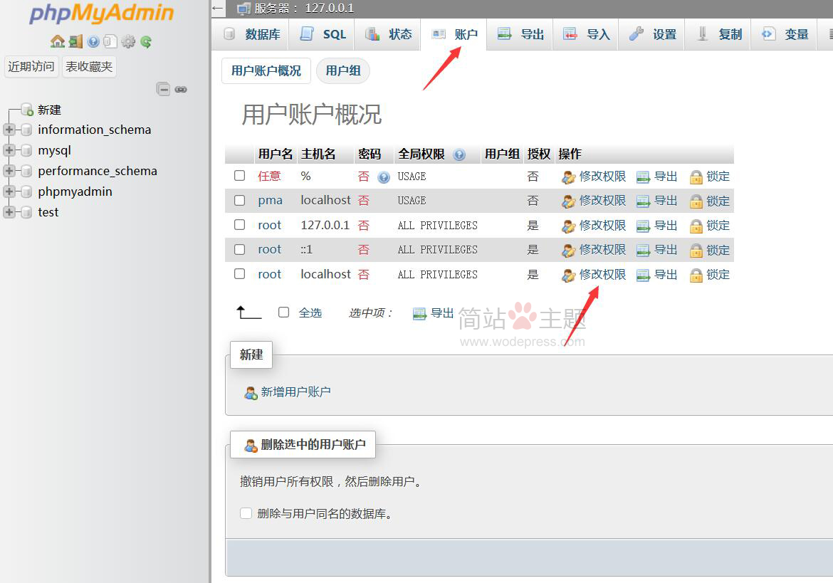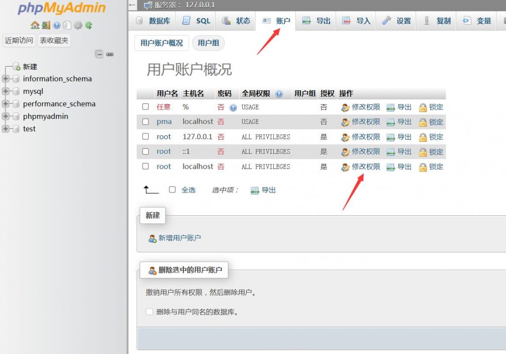 2、选择“帐户”,进入后,找到root,点击“修改权限”