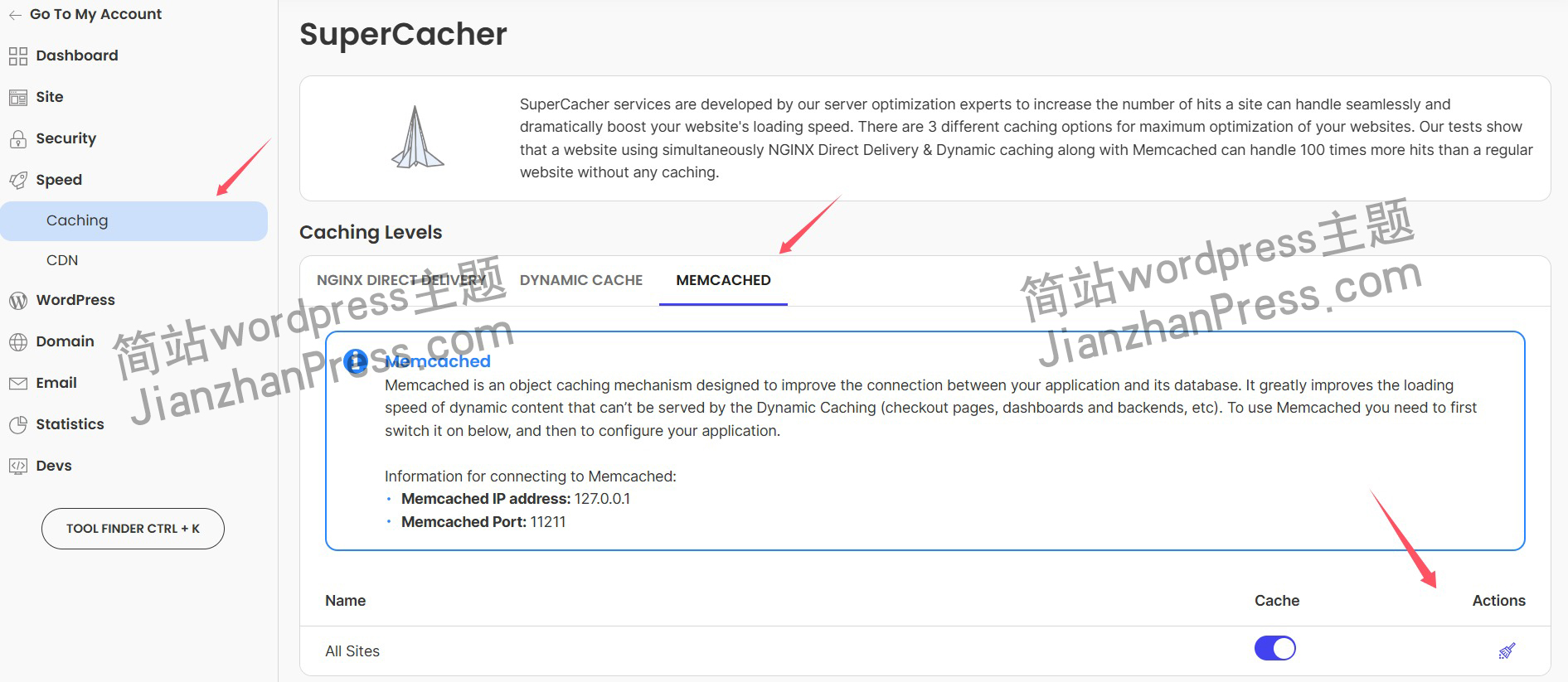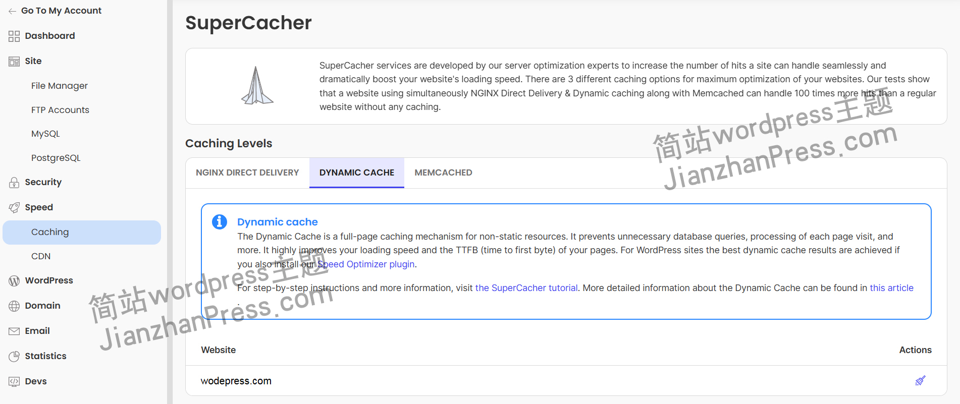 在主机管理的左侧菜单栏中找到“Speed”,进入下面的“Caching”对应的页面。