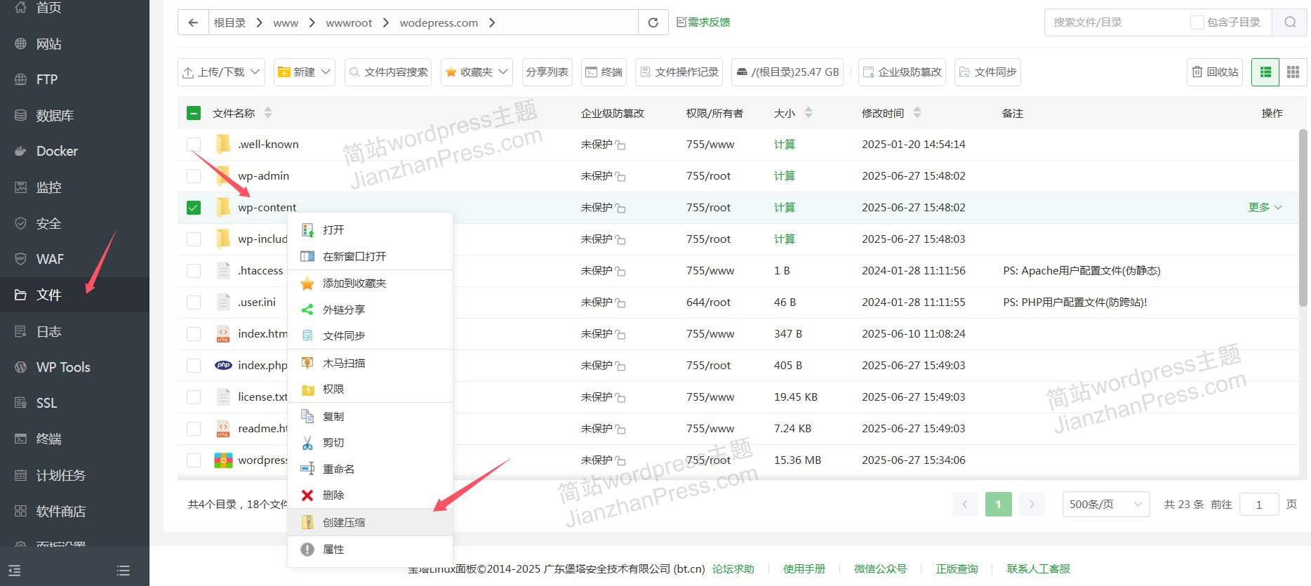 2、在网站所在目录中找到“wp-content”文件夹,右键会出现“创建压缩”