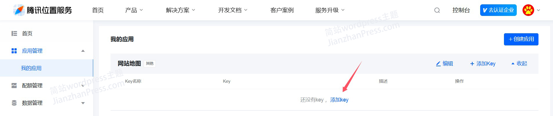 4、应用创建完成后,需要给应用添加Key,在上面找到“添加Key”进行下一步的操作。