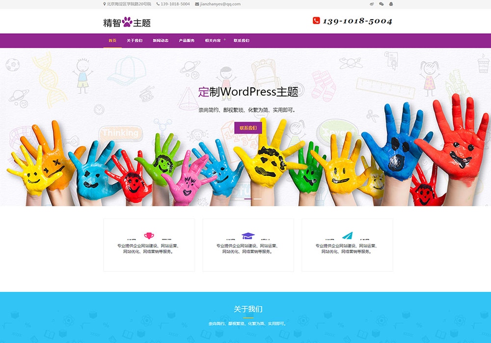 紫色风格的幼儿艺术教育公司wordpress主题,可以适用于幼儿园、早教机构、教育培训公司。