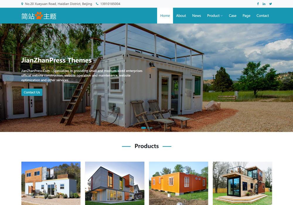 蓝色大气wordpress外贸主题,适合用于做集装箱活动房,民宿太空舱的公司使用。